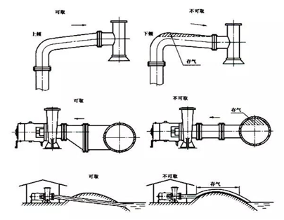 四、吸入管路的布置,一定要設法使得從吸入面到泵具有有向上的坡度(1/50左右)以使管路中不存空氣,如圖7-3。但是管道淹沒(méi)在水下時(shí),從吸水管到泵取向下的坡度。