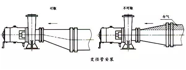 泵出口管道卜的異徑管府靠近泵的出口。頂部吸人和排出的泵,在間距很小時(shí),可采用偏心異徑管加大間距。